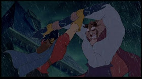 This has all been good fun, but immediately following this rather humorous battle sequence is the final confrontation between Gaston and the Beast and it is the most dramatic and tense scene in the entire film. I’ve mentioned that the Beast and Gaston are opposites in almost every way and no scene better illustrates that than this one. For one thing, Beast is… well, a beast and Gaston is a hunter. Hunters have a really bad reputation in Disney films. It started with Bambi, continued with pig headed hunter characters in The Sword in the Stone and The Fox and the Hound, and has come full circle with Gaston. As opposed to being an invisible menace like he was in Bambi, here the hunter is a fully realized character with a name, face, and personality.